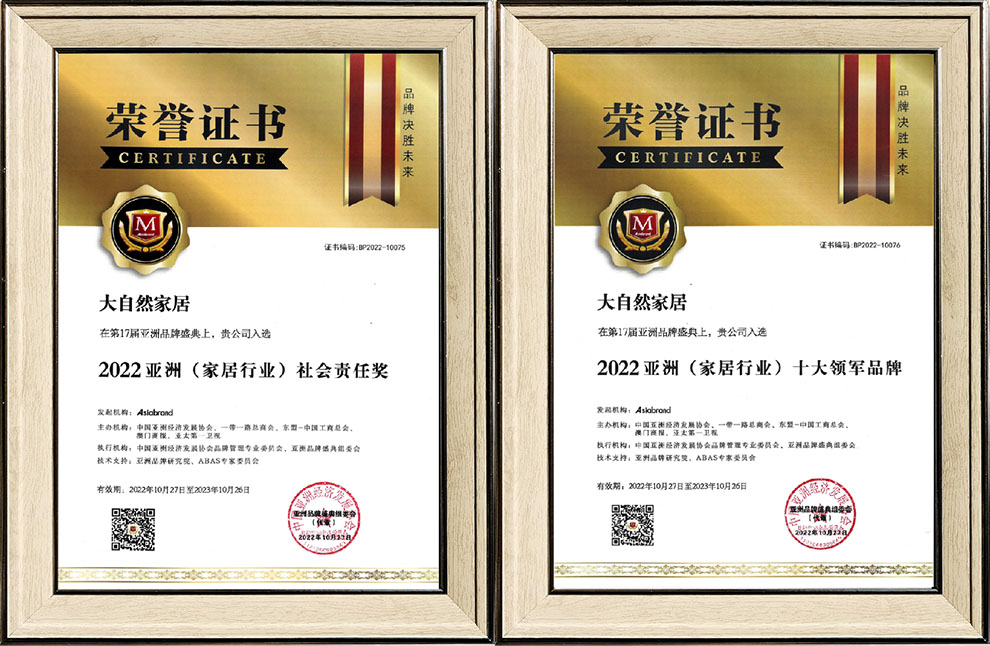 今年大自然家居品牌價(jià)值達(dá)到840.55億元,比去年增加73.68億元,同時榮獲“2022亞洲(家居行業(yè))社會責(zé)任獎”和“2022亞洲(家居行業(yè))十大領(lǐng)軍品牌”兩個獎項(xiàng),以自信之態(tài)向世界傳達(dá)出建設(shè)綠色人居的美好構(gòu)想。