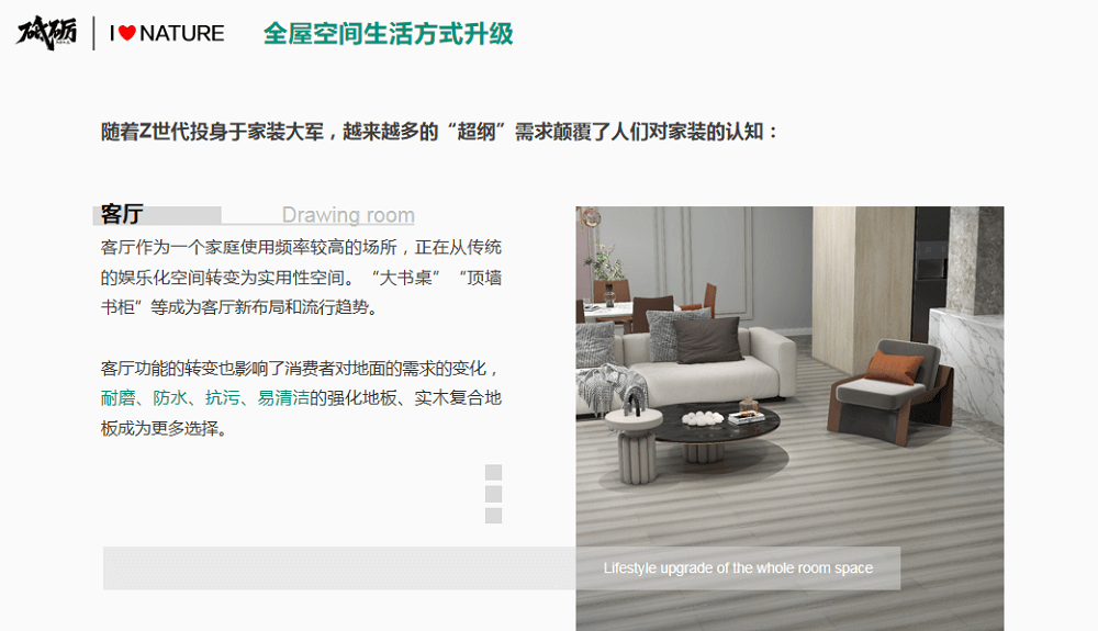隨后,《2019粵港澳大灣區(qū)住宅精裝交付標(biāo)準(zhǔn)白皮書》主編、想象數(shù)科合伙人李可欣女士現(xiàn)場(chǎng)發(fā)布《2023綠色家居消費(fèi)趨勢(shì)白皮書》。白皮書中指出:隨著消費(fèi)者全空間的生活方式升級(jí),全屋通鋪木地板成為潮流趨勢(shì),重塑新時(shí)代家居空間。