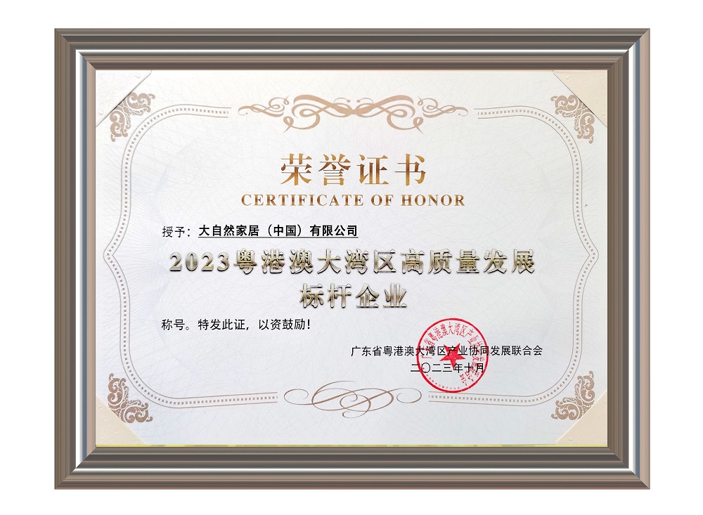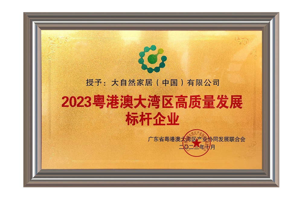 大自然家居作為一家專注于環(huán)保家居產(chǎn)品創(chuàng)新與研發(fā)的企業(yè),在長(zhǎng)期的發(fā)展中積極響應(yīng)國(guó)家環(huán)保政策,不斷推出符合國(guó)際標(biāo)準(zhǔn)的高質(zhì)量產(chǎn)品。憑借其卓越的企業(yè)實(shí)力和持續(xù)的創(chuàng)新能力,大自然家居成功獲得了“2023 粵港澳大灣區(qū)高質(zhì)量發(fā)展標(biāo)桿企業(yè)”稱號(hào)。