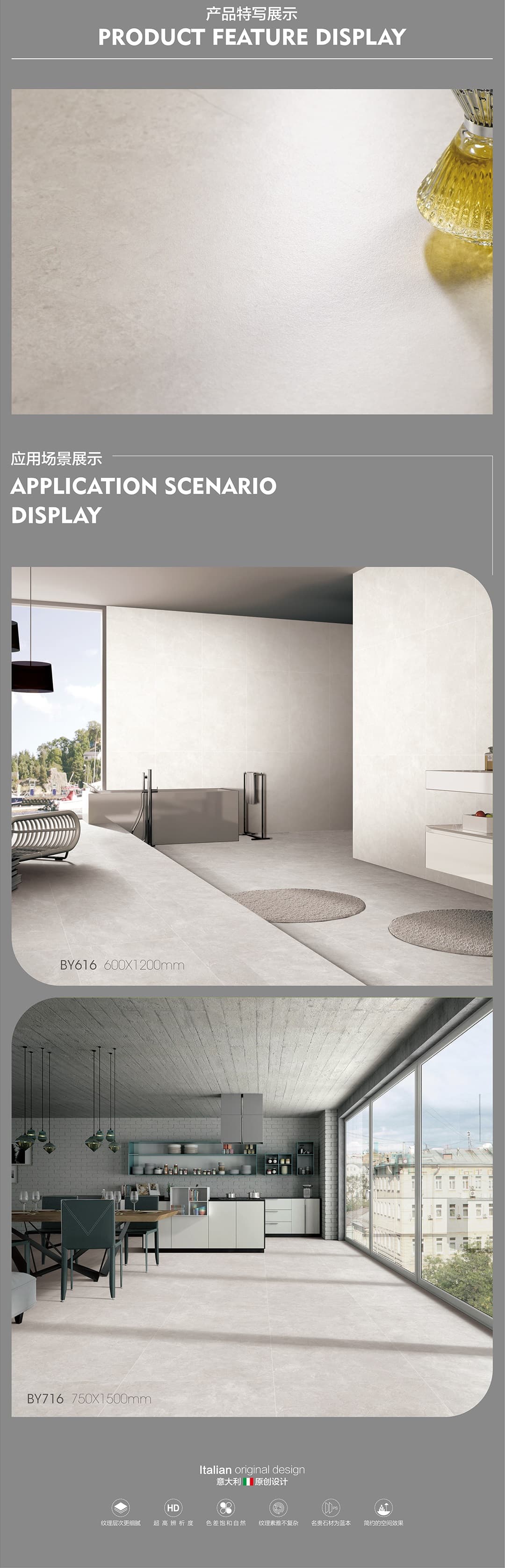 | 產(chǎn)品特性 | 表面柔和,防污效果強(qiáng),防滑R10指標(biāo)高,抗折強(qiáng)度好 |